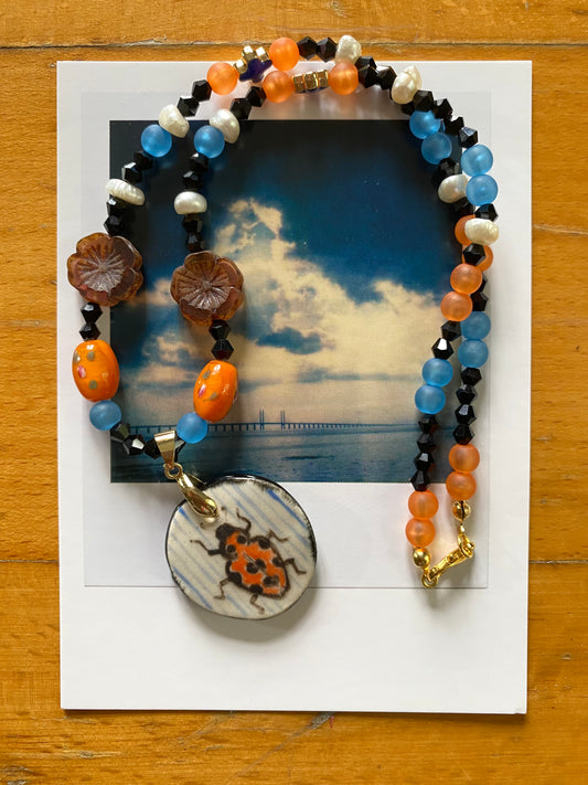 Delicate ceramic ladybug pendant with freshwater pearls and glass beads