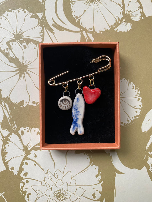 Handmade ceramic sardine, eye and heart gold plated brooch-cute and quirky jewellery