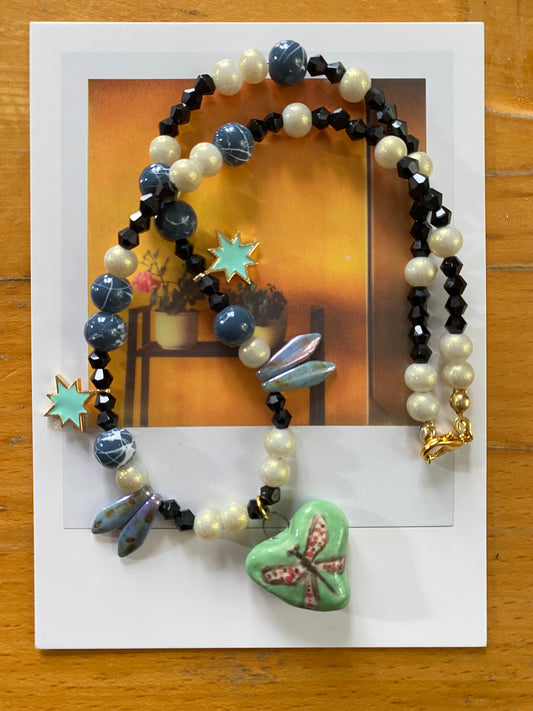 Adorable black cat heart pendant necklace with glass beads and pearls - ceramic charm jewellery