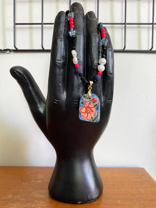 Ceramic red flower charm with freshwater pearls and glass beads necklace