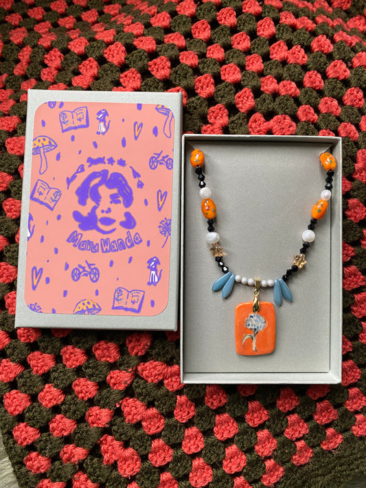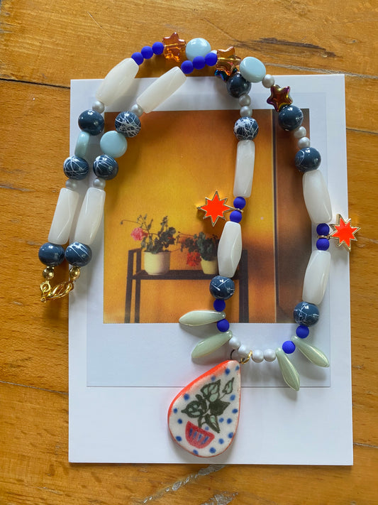 Dandelion orange and blue ceramic charm necklace with freshwater pearls and glass beads