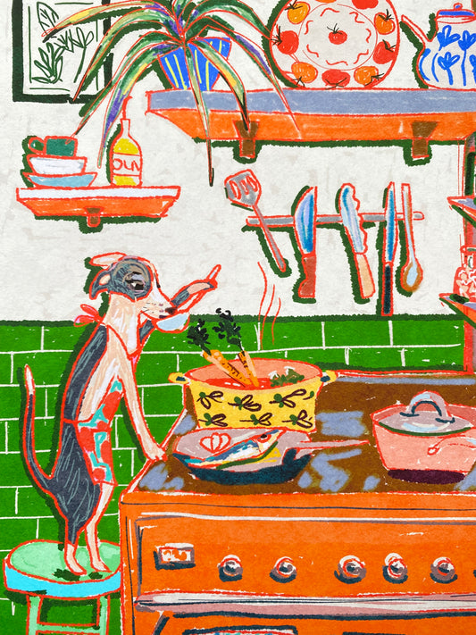 Whimsical Dinner Time Dog Art Print - Chef Kiss Wall Decor