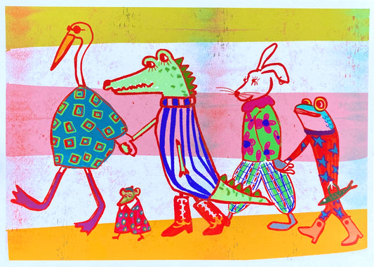 Friendship Animal Art Print - "Besties Walk" featuring sardine, crocodile, bunny, mouse and heron